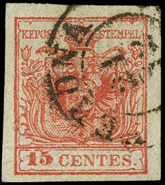 Lotto 6193 - Lombardo Veneto: n.15b+14b+15b, 15c rosso vermiglio intenso, carta costolata, striscia di tre con II, I e II tipo, 1851