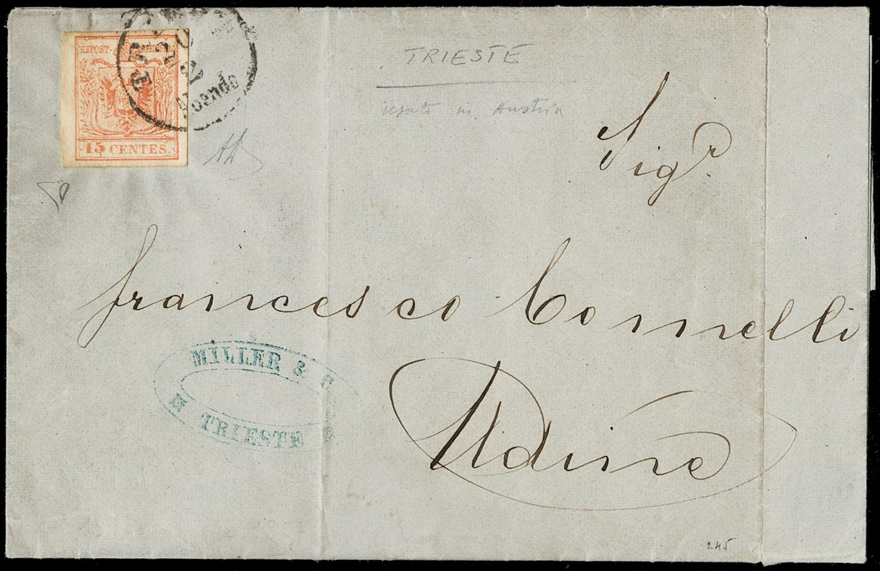 Lombardo Veneto 1857: 15c rosso vermiglio chiaro CM usato in Austria da "TRIEST 20/2 ABENDS" a Udine. CF Diena (Sassone 20a+pt.12 - € 10.500)