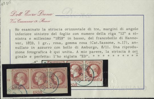 1859 - Hannover: 1 gr striscia di 3 adf con numeri di tavola e millesimo - Striscia di tre del 1 groschen rosa n17, angolo di foglio con numero di tavola "12" e millesimo "1859", annullata "Hamburg 8/11". Splendido e raro, CF Enzo Diena