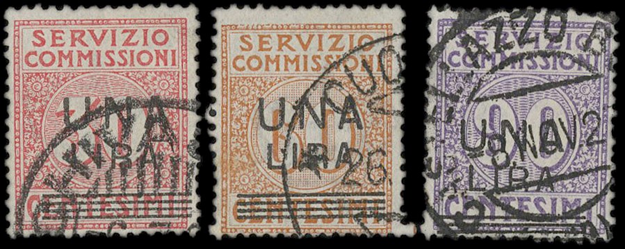 1925 - Regno d'Italia: Servizio Commissioni, soprastampati, la serie completa di tre valori usati. CF A. Diena, Bottacchi (Sassone 4/6 - € 6.500)
