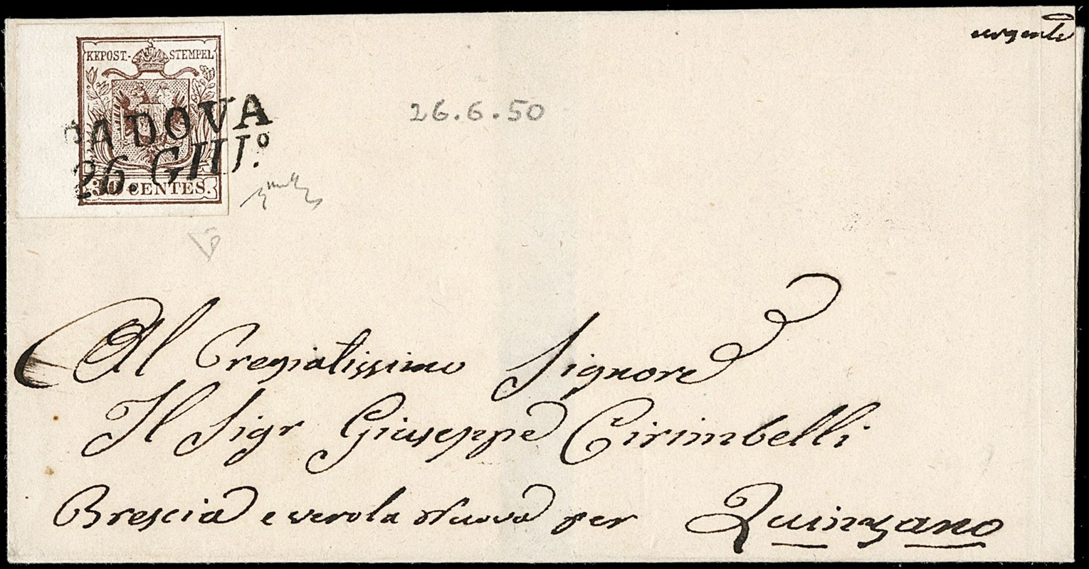1850 - Lombardo Veneto: 30c bruno BdF 7mm su lettera da "PADOVA 26 GIU.°" Primo mese d'uso del 30c (Sassone 7b - € 825++)