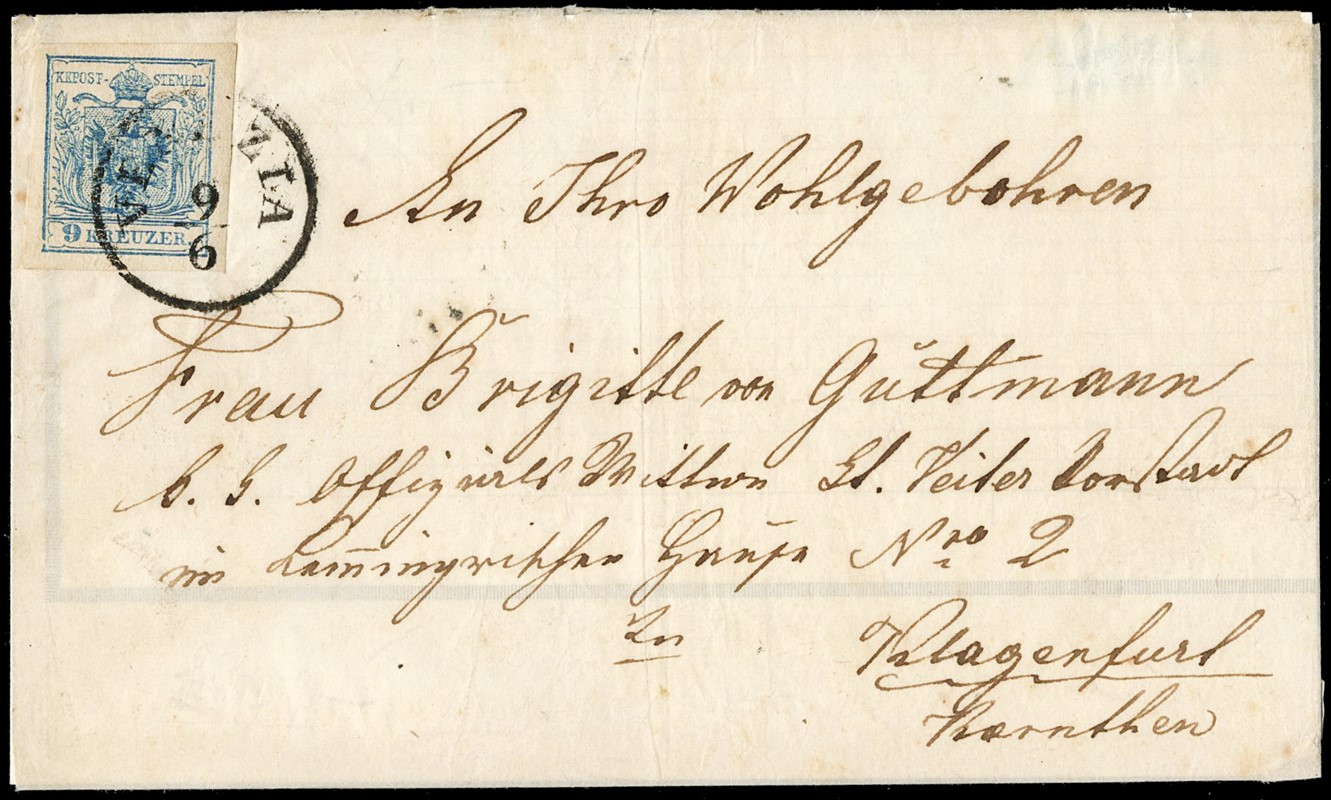 1851 Lombardo Veneto: Austria 9kr azzurro II tipo da "VENEZIA 9/6" a KLAGENFURT. Lettera spedita e non tassata dopo la circolare del 7 maggio 1851 che vietava l'uso dei francobolli di Austria in Lombardo Veneto (Sassone Austria 5 - € 2.500+pt.9 - € 2.000 = € 4.500)