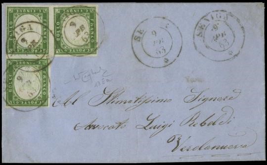 1863 - Lombardo Veneto Annulli: Sardegna 5c verde, IV emissione, IV composizione, blocco di 3 a "seggiola" da "SENIGA 9 APR 63" a Verolanuova. Splendida e rara. CF Raybaudi (Sassone 13Ea+pt.9 - € 3300)