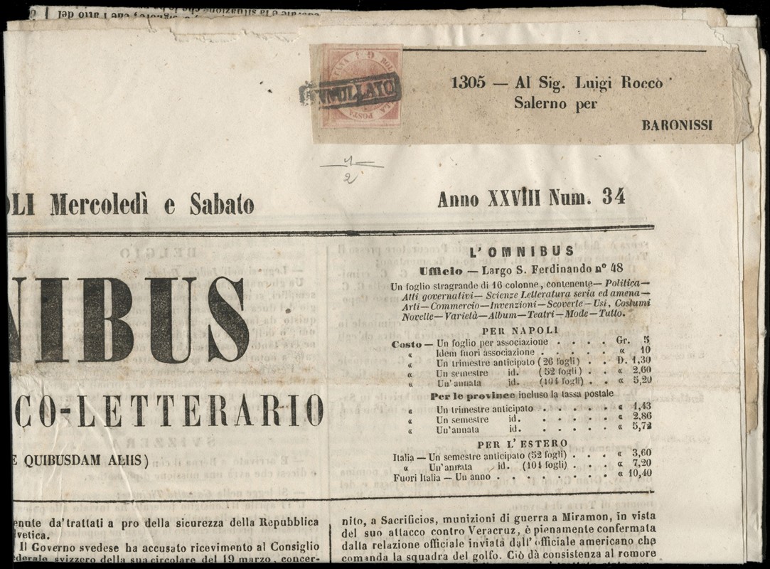 1858 - Napoli: 1/2 grano carminio II tavola “ANNULLATO” su "L'OMNIBUS" giornale n.34 del 28 aprile 1860 “IN PARTENZA DA NAPOLI 28 APR 1860” per Baronissi. CF Manzoni (Sassone 2 - € 4.500)