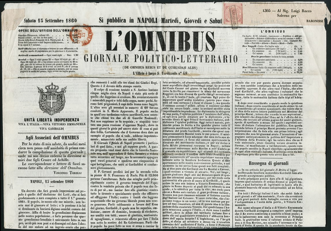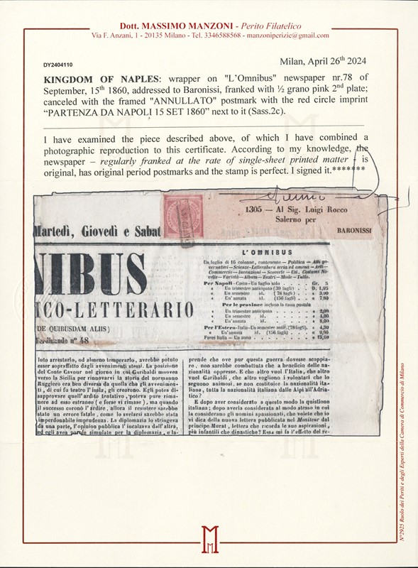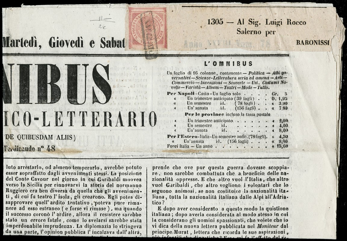 1858 - Napoli: 1/2 grano rosa II tavola “ANNULLATO” su "L'OMNIBUS" giornale n.78 del 15 settembre 1860 “IN PARTENZA DA NAPOLI 15 SET 1860” per Baronissi. CF Manzoni (Sassone 2c - € 5.700)