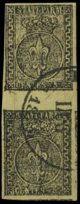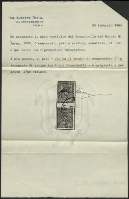 1852 - Parma: 5c giallo chiaro (verdino) coppia verticale con interspazio di gruppo, annullata con bollo di Piacenza. CF A. ed E. Diena (Sassone 1b var - €9.000+33%)