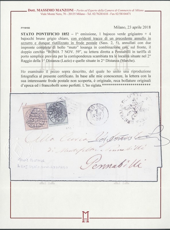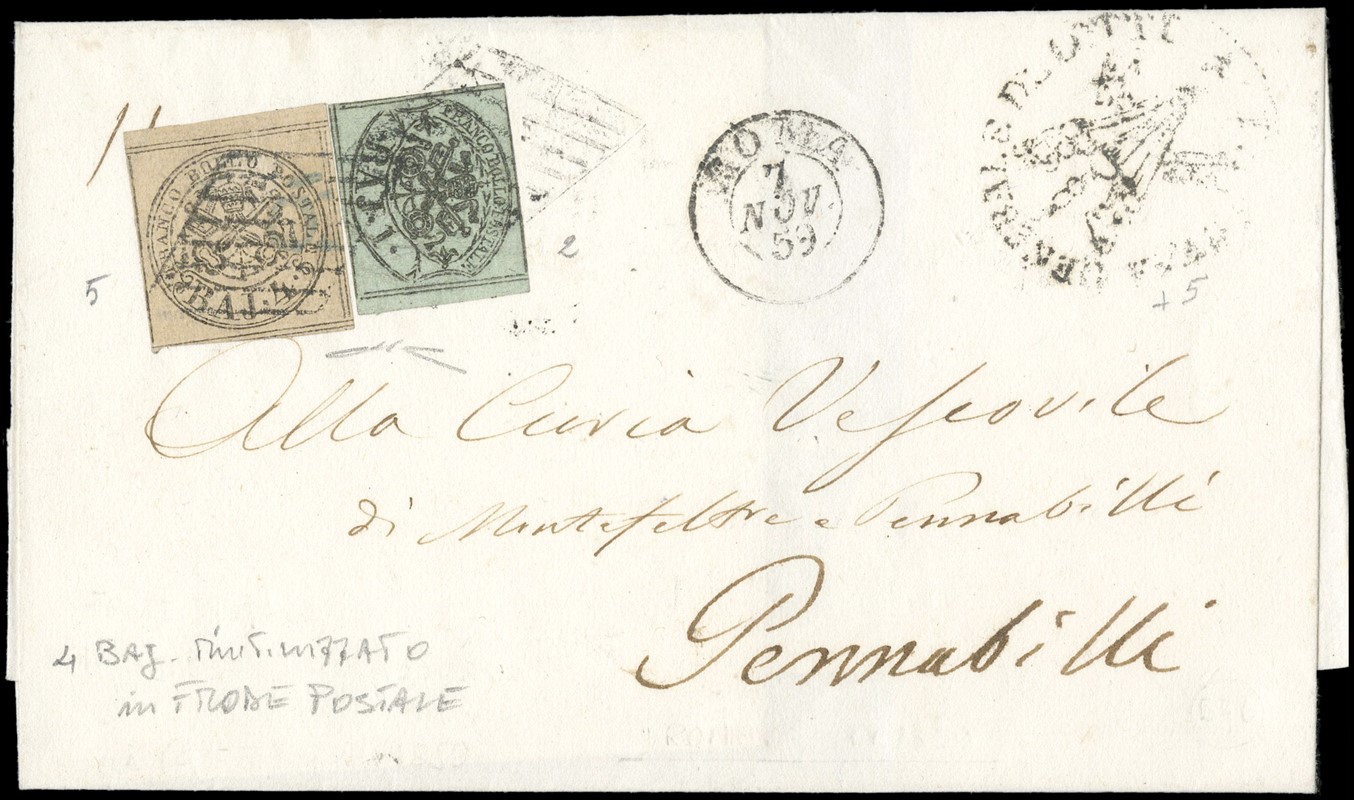 1852 - Pontificio: 1 baj verde grigiastro, BdF a sinistra, e 4 baj bruno grigio chiaro, BdF in alto, da "ROMA 7 NOV 59" per Pennabilli. Il 4 baj reca evidenti tracce di un precedente annullo in azzurro ed è stato riutilizzato in frode postale non scoperta. Molto interessante e di grande qualità. CF Manzoni (Sassone 2+5 - € -)