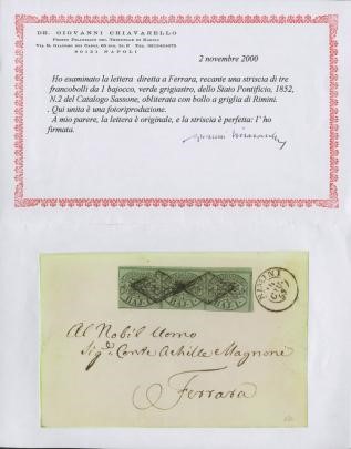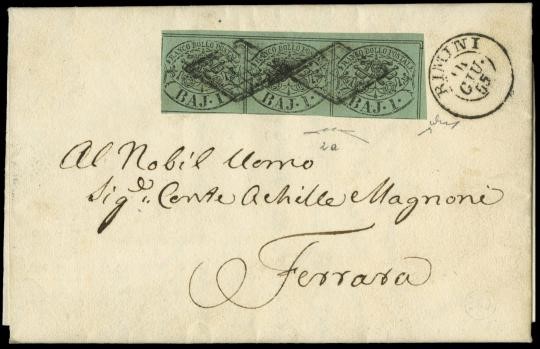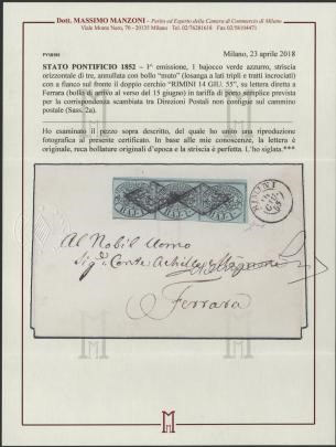 1852 - Pontificio: 1 baj verde azzurro striscia di tre AdF annullata con bollo "muto" da "RIMINI 14 GIU. 55" in annullo a doppio cerchio, diretta a Ferrara. Splendida. CF Chiavarello e Manzoni (Sassone 2a+pt.2 - € 3.000+)