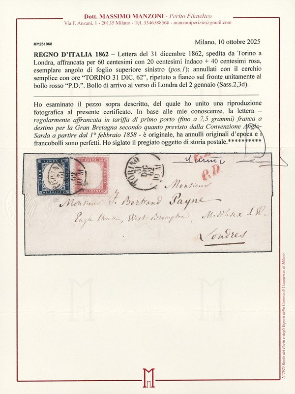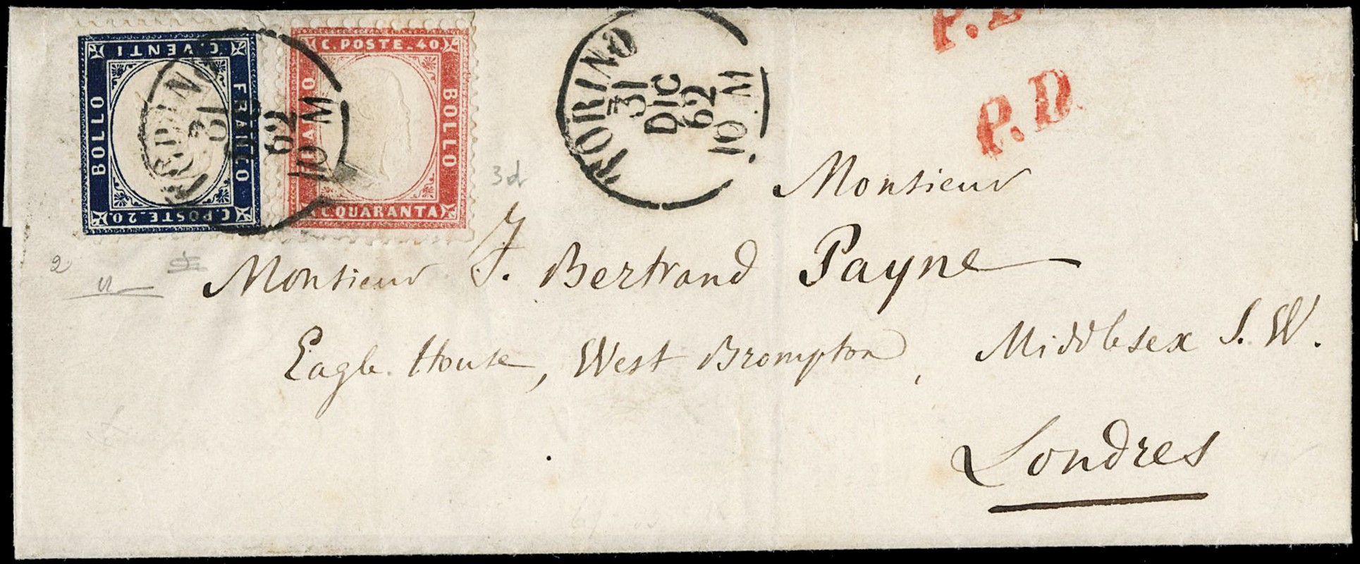 1862 - Italia Regno: 20c indaco con 40c rosa AdF superiore sinistro da "TORINO 31 DIC.62" a Londra. Bollo di arrivo al verso di Londra del 2 gennaio. Lettera regolarmente affrancata in tariffa di primo porto (fino a 7,5 grammi) franca a destino per la Gran Bretagna secondo quanto previsto dalla convenzione anglosarda a partire dal 1 febbraio 1858. CF Manzoni (Sassone 2+3 - € 1.000)