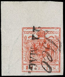 Lombardo Veneto 1857: 15c rosso vermiglio chiaro CM usato in Austria da "TRIEST 20/2 ABENDS" a Udine. CF Diena [..]