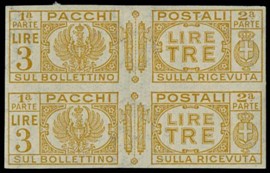 1890 - Regno d'Italia: Francobolli per pacchi soprastampati, 2c su 10c oliva, BL4 con soprastampa capovolta, di [..]