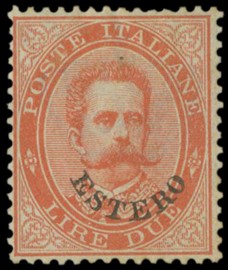 1881 - Uffici postali all'estero Levante: 2L vermiglio soprastampa spostata a destra (Sassone 17b - € 320)