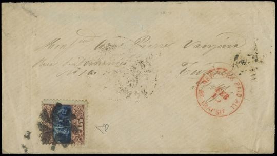 1869 - Stati Uniti d'America: 15 cents, I tipo, bruno e azzurro, annullato con bollo a stelle irregolare di New York, da New York, febbraio 1870 per Torino. Splendida CF Enzo Diena (Yvert 2010 € 1.000) Prezzo Catalogo: 1000