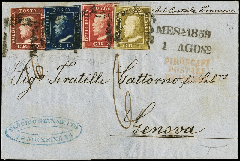 Lotto 663: 1859 - 1gr bruno oliva chiaro, II tav., 5gr carminio I tav., 10gr azzurro cupo e 50gr lacca bruno su lettera da "MESa 1859 / 1 AGOS°" per Genova "col Postale Francese", tassata allo sbarco "6" decimi di lira per il terzo porto sardo. Insieme splendido e molto raro. Quotato dal Sassone oltre € 237.000 è proposto in asta a € 20.000