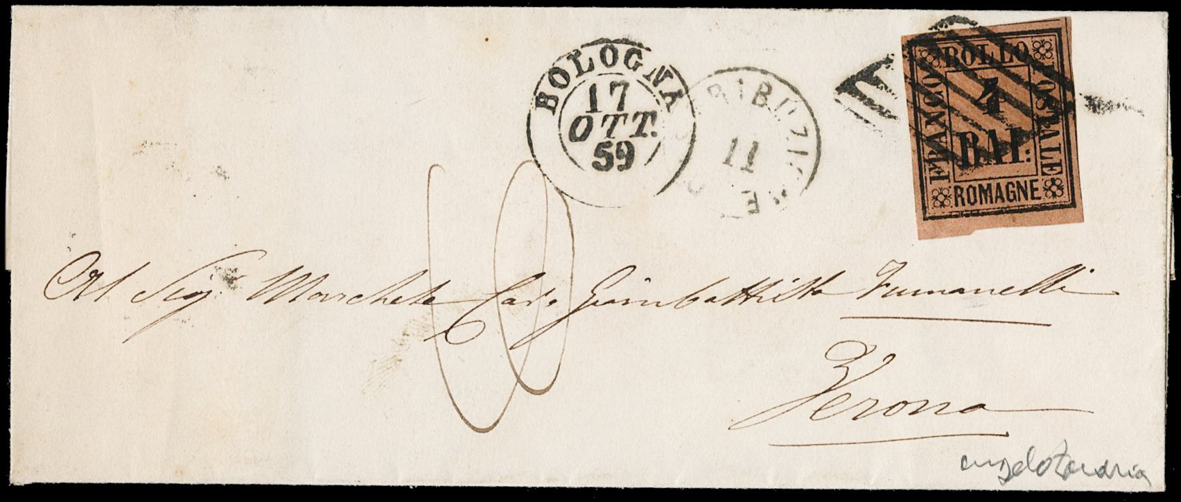 1859 - Governo Provvisorio delle Romagne: 4baj fulvo (colore molto intenso) da "BOLOGNA 17 OTT. 59" a Verona. CF Zanaria (Sassone 5 - € 1.625++)