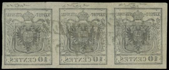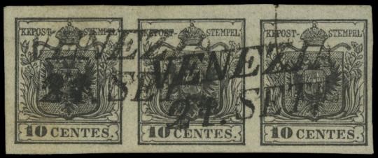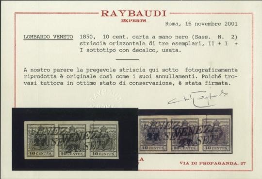 1850 - Lombardy Venetia: 10 cent. handmade paper black horizontal strip of 3 stamps, II+I +I subtype with set-off, used "VENEZIA 21. SETT." Very nice Certificate Raybaudi (Sassone 2f - 1.450++)