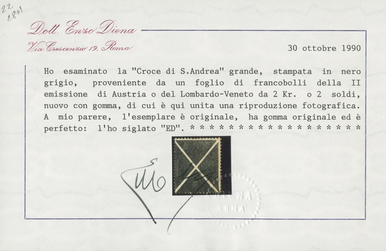 1858 - Lombardo Veneto: II emissione, croce di S. Andrea nera, formato grande. CF E. Diena (Sassone B - € 1.100)