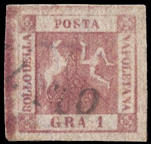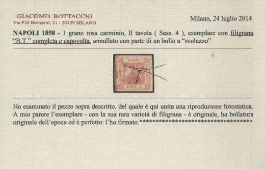 1858 - Naples: 1 grano carmine rose, II plates, stamp with watermark "B.T:" completed and inverted, cancelled with section of "Svolazzo" handstamp. Very nice Bottacchi certificate (Sassone 1 - € 1.500)