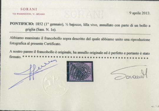 1852 - Papal State: 1/2 baj vivid lilac, cancelled grid postmark. Fine, Sorani certificate (Sassone 1e - € 2.000)