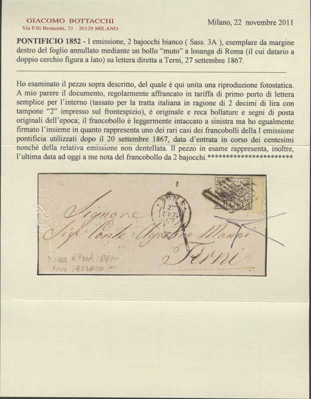 1852 - Papal states: 2 baj white, I issue, right sheet margin (slightly short on the left), lozenge cancellation from Roma "ROMA 27 SET 67" to Terni. Rare case of I issue stamps used 7 days after validity's end. Very interesting rarity, CF Bottacchi (Sassone 3A)