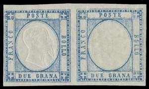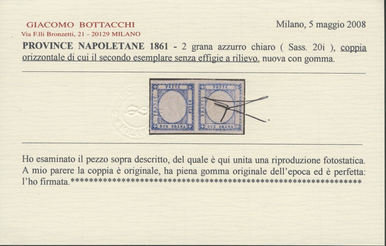 1861 - Neapolitan Provinces: 2g. light blue horizontal pair right copy without effigy, mint original gum. Very fine. Bottacchi certificate (Sassone 20i - € 4.500)