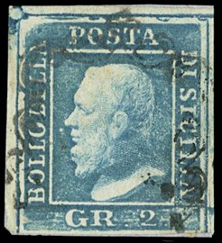 1859 - Sicilia: 2gr azzurro I tav. pos.1 AdF (Sassone 6 - € 220++)