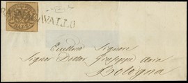 1852 - Pontificio: 3 baj bruno grigiastro stampa oleosa da "BAGNACAVALLO" (RA) a Bologna. Splendida (Sassone 4f+pt.4 [..]
