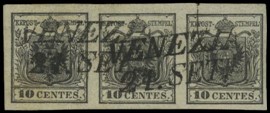 1850 - Lombardy Venetia: 10 cent. handmade paper black horizontal strip of 3 stamps, II+I +I subtype with set-off, [..]