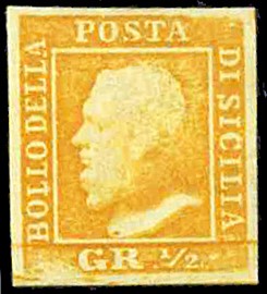 1859 - Sicily: 1/2 g. orange, I plate, Palermo paper, position 99, retouch (lines on the nape). Very fine. Bottacchi [..]