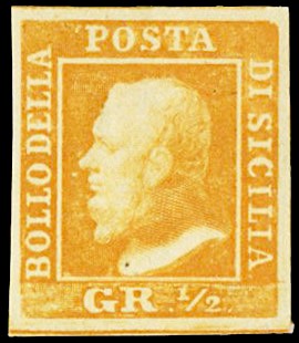 1859 - Sicilia: ½ gr arancio, I tav. (Sassone 1 - € 1.300)