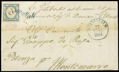 About fifty showpieces from Naples with the distinctive 19th century flourish cancel, introduced to prevent re-usage of stamps. A very specific area, that doesn’t lack amateurs. Among the most significant offers there is lot 134, that includes a 2 grana with Vittorio Emanuele II and the manual in “bastard” type, used in Dentecane (Avellino) on the 27th of June 1861.